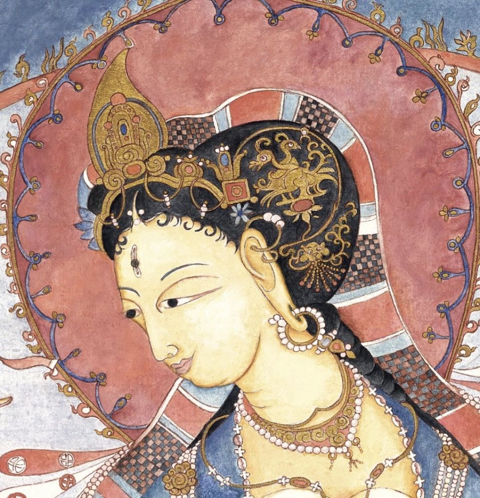 The concept of the goddess Prajnaparamita originally began as a reverence for sacred writings about paths to wisdom, handed down and preserved, in a time when books and writings and education were scarce and hard to come by. Over time these sutra writings, called the “Perfection of wisdom”, or “Prajnaparamita”, were distilled into two great works, the Diamond Sutras and the Heart Sutras. These texts were the subject of worship in Mahayana Buddhism, in much the same way that devotional figures were. Under the influence of Tantric Buddhism they became deified as the Goddess of Wisdom. Prajnaparamita is also called the mother of all three times - the past, present, and future. She is radiantly beautiful and sweet.